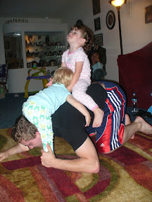 Saturday night we went over to Gamma and Gampa's house. I made beef fajitas for dinner and we finally ate the banana cream pie. Eck was happy to have his pies. Both girls quickly fell in love with Eck. Tanae jumped on his back, but Adia wasn't quite tall enough to climb on. Tanae tried to help her, but just ended up grabbing her by the head. That didn't go over well. Adia and Tanae gave us the hint it was time to leave by all the eye rubbing, yawning and Tanae grabbing shoes. They both gave lots of hugs and kisses to Gamma, Oma and Lani.