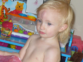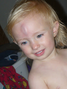 Grocery shopping was interesting with both kids. Neither of them wanted to ride in the cart and Adia only wanted DiDi. She wanted nothing to do with me. When we came home, we ate some lunch and Adia ate almost a whole can of Dinty More stew on her own. She really loves that stuff. While they were playing, Adia tripped on a toy and went flying through the air. She smashed her head into the corner of the wall. It instantly bruised in a line and started to puff up. It's definitely the scariest fall we've had. I called the triage nurse who gave me all the signs to look for and since Adia never lost consciousness, wasn't disoriented and pupils were still responding, we didn't take her to the doctor. I did have to wake her up every 2 hours, all night long, to make sure she could still wake up.