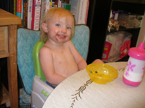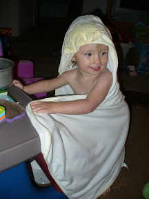 I took a bath with her after dinner so I could cool off and clean her up. We had tons of fun and blew lots of bubbles. She especially enjoyed washing daddy's feet. I normally wash her feet and make sure I give them a good tickle too. She said she wanted to wash Daddy's feet too so he dangled them over the side of the tub. I soaped them up and then Adia started tickling him! He was laughing so hard which made Adia laugh and giggle even more. It was so funny. After her bath, she got to do the naked run. She was only wearing the hooded towel and ran around like it was her cape. She quickly learned that she needed to hold the bottom up or she'd trip over it.