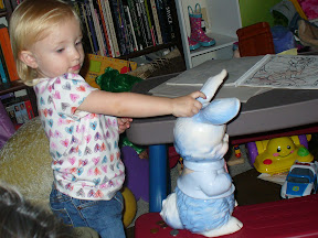 Gamma arrived later that evening. She let Adia search through her purse and Adia found some "bunny money." Scott had a bunny bank that his Opa made him as a kid. He filled it with enough money to buy his Nintendo. When we had Adia, Gamma and Gampa passed it down to Adia. She now loves to find change and put it in the bunny. She even calls it bunny money. We went to dinner after she had begged all our change off of us. She was really good at dinner and only freaked out as I was finishing my meal.