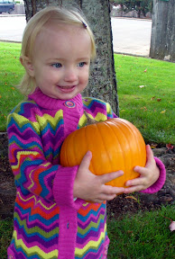 Adia desperately wanted to go outside, so I decided it would be a good chance to take some pics before it started raining all the time. I bundled her up in her new sweater, that I absolutely love. We headed out the door and Adia immediately started yelling, "pumpkin!" when she saw the pumpkins on the porch. She wouldn't let us go down the stairs without one. We played around and took pictures. She wouldn't cooperate though and then the wind picked up. Her nose started running like crazy and it was obvious she was cold too. She only wanted me to pick her up and hold her so we went back inside. I'm glad I got a few cute pictures though.